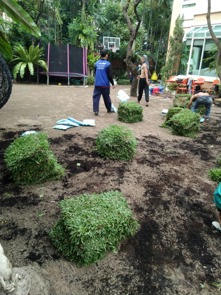 ปูหญ้าสำเร็จรูป เช่น หญ้านวลน้อย หญ้ามาเลย์ หญ้าญี่ปุ่น